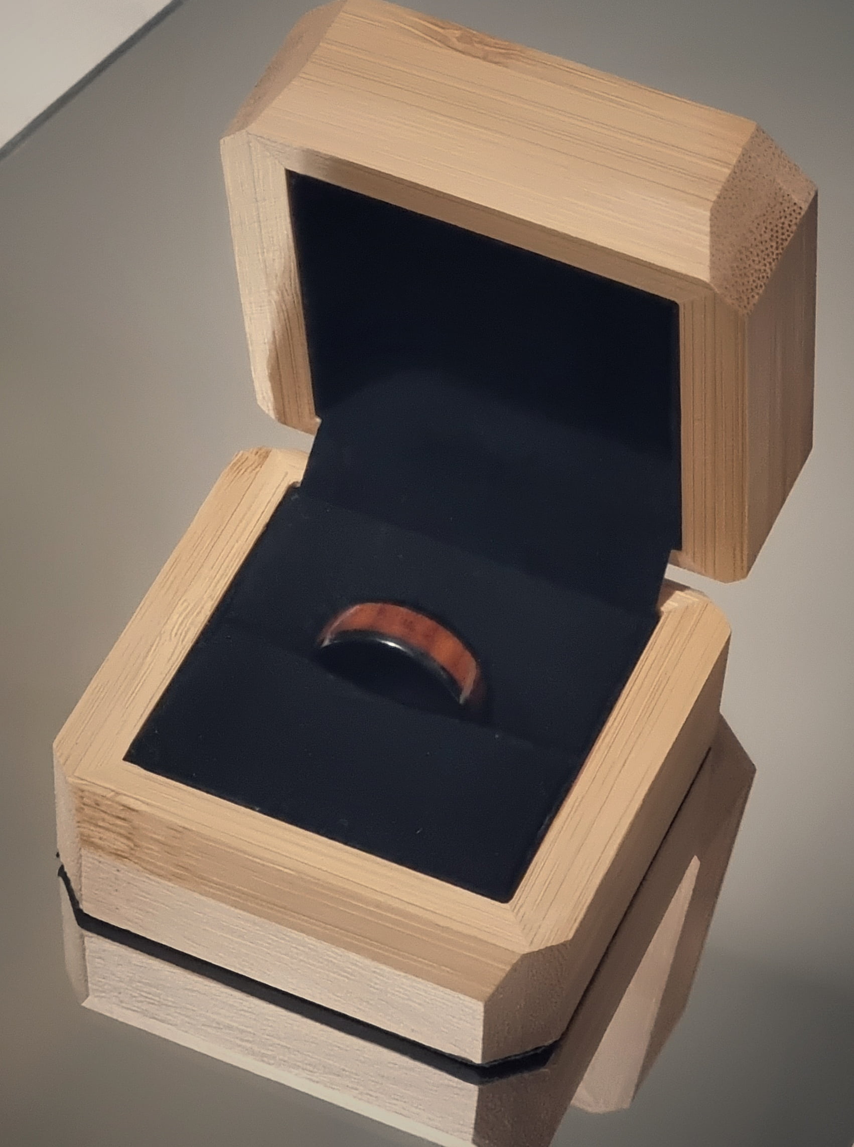 Frame that special ring in one of our bamboo presentation boxes, customised with 2 lines of text and a dividing line if ytou like.