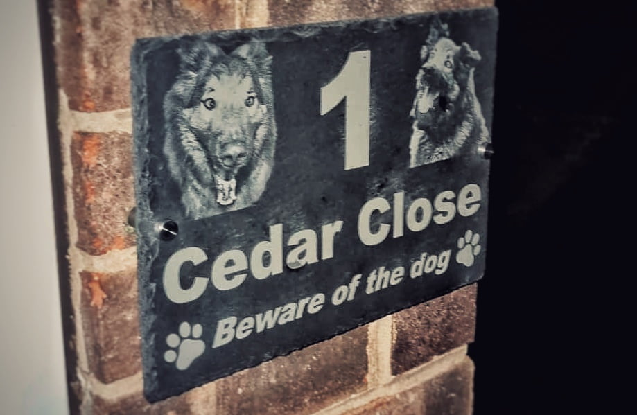 Customised slate House name/Number sign. Simply select what text you would like and include up to 2 images to be engraved or select a border of your choosing. Each sign is engraved and can come witrh 2/4 holes and fixings which will allow you to place it flat on a wall or have it stand…