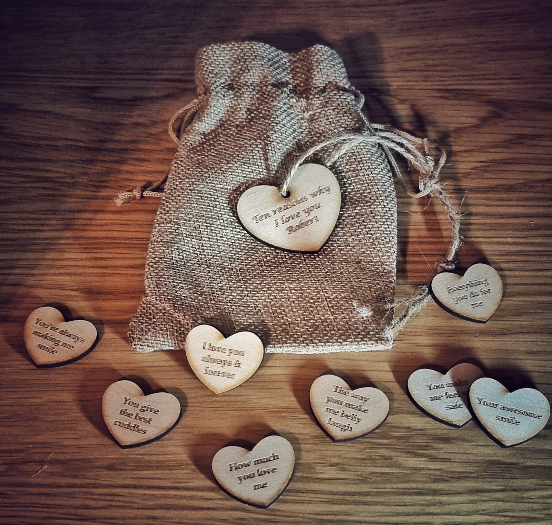 Give something truly special and personal to your loved one with this ten reasons why hessian bag and custom love heart tokens.